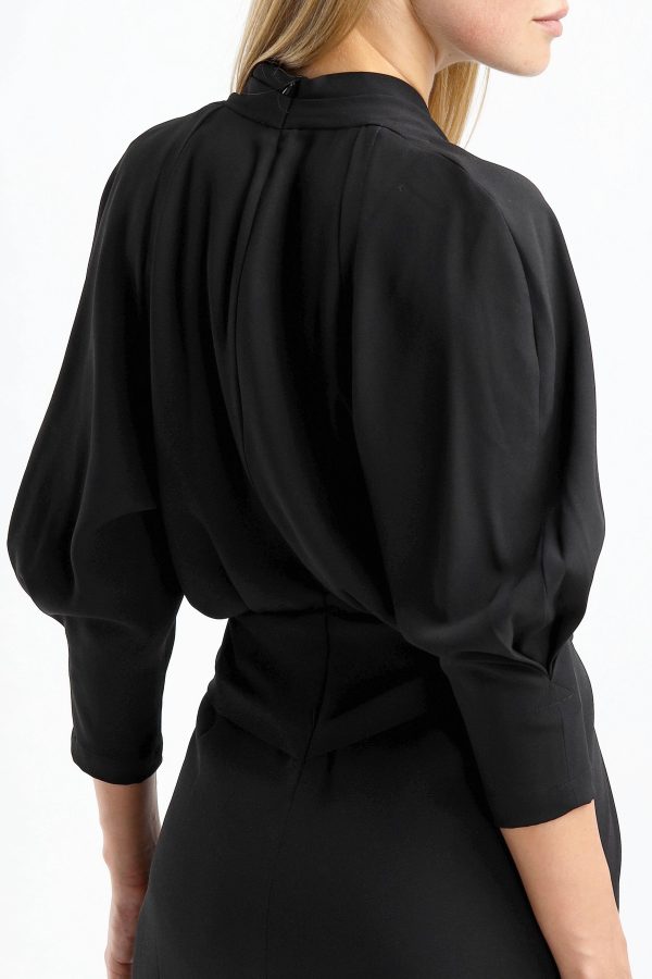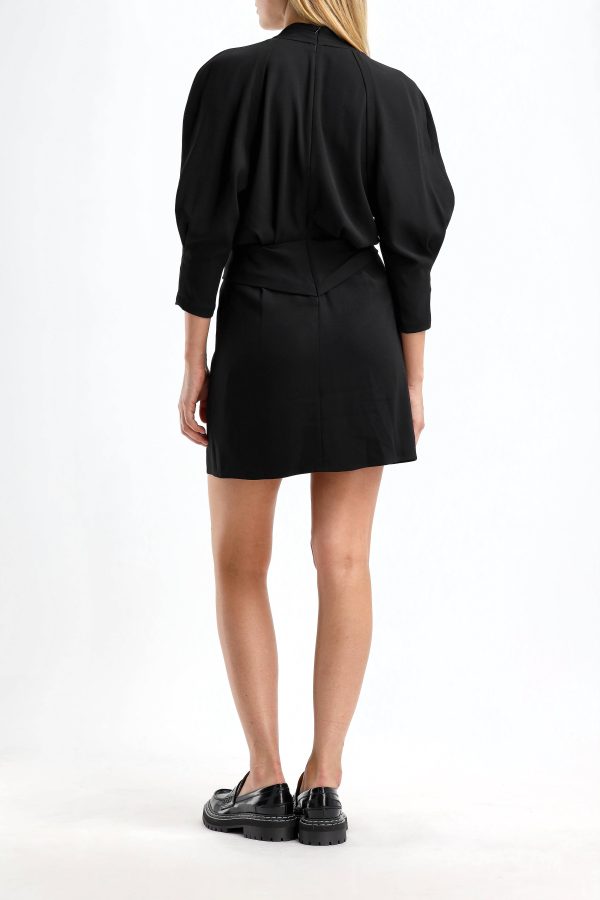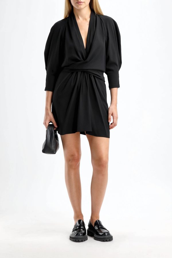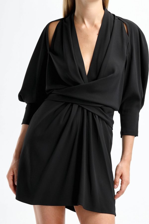 Dress Katie in black Mini length Deep V-neck Zipper on the back Shoulder cut outs Draped and pleated front Care: Dry cleaning Material: 75% acetate, 25% polyester