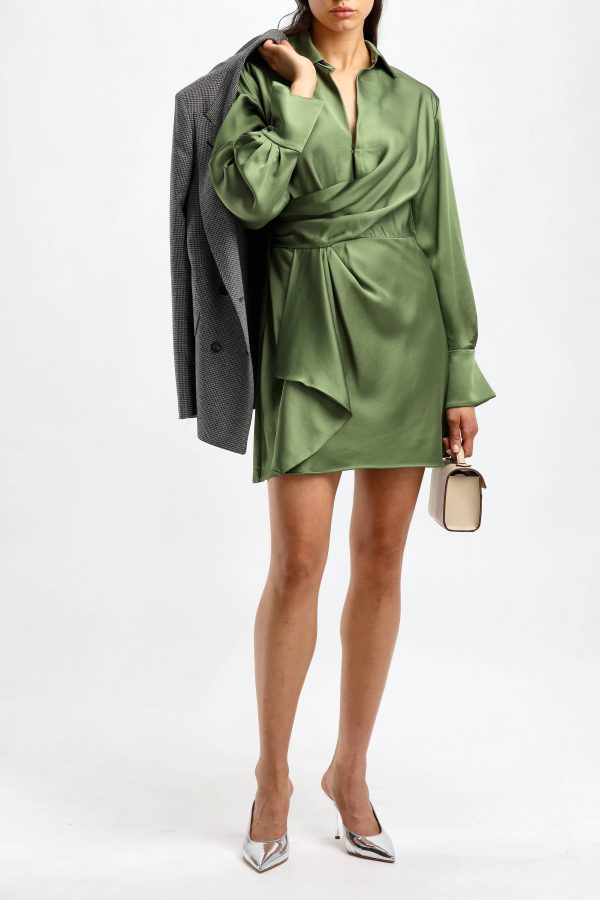 Green acetate shirt dress Midi length Shirt collar V-neck Wrap silhouette Side zipper Bishop sleeve Button cuffs Care: Dry cleaning Material:89% acetate, 11% polyester