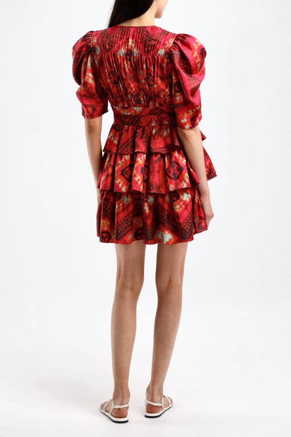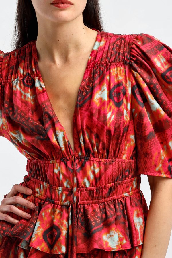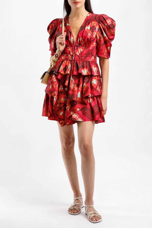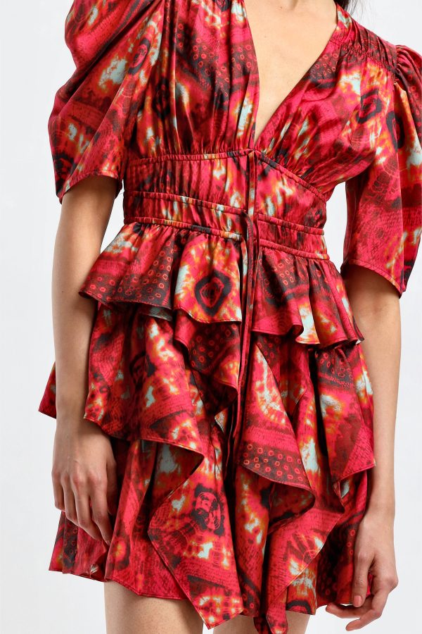 Wild rose dress Mini length V-neck Short puff sleeves Cords at the waist Asymmetrical ruffles on skirt Care: Dry cleaning Material: 100% silk
